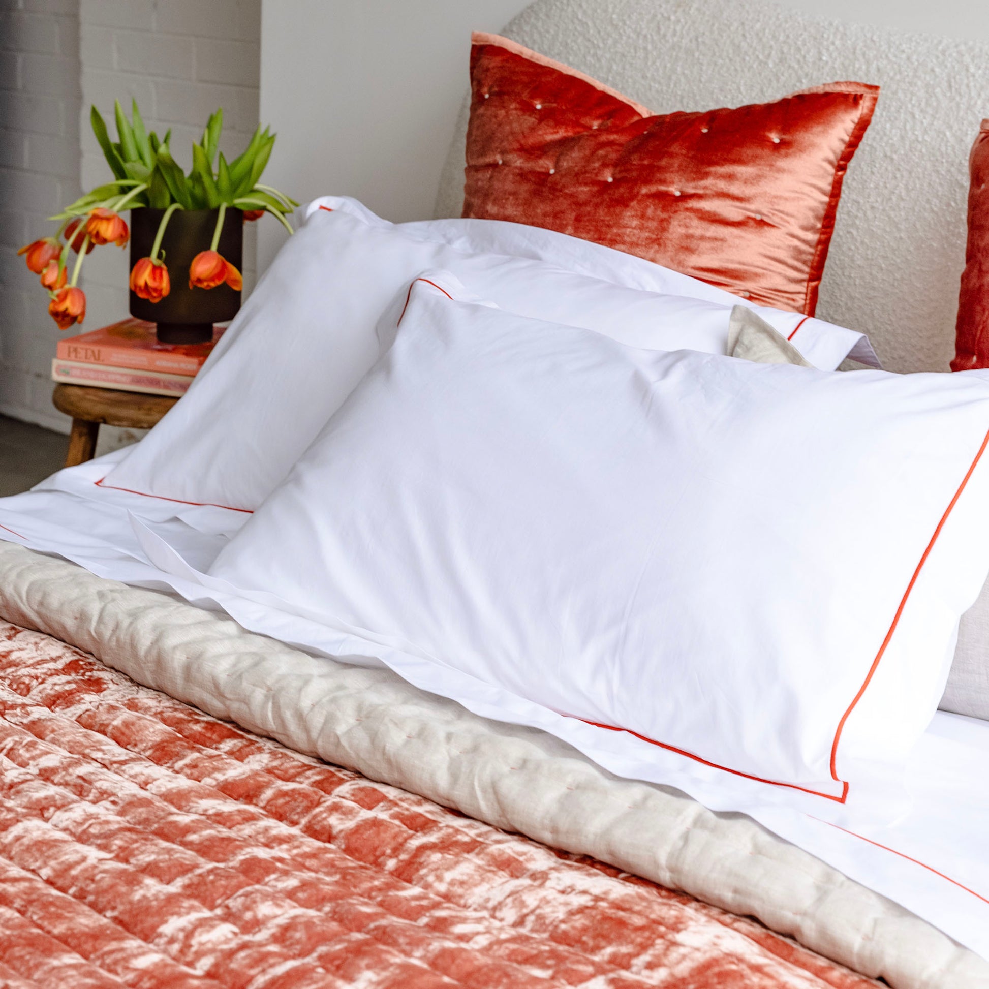 Beautiful, classic, smooth white Italian cotton, Queen or King flat sheet and standard size pillowcase sets featuring an oxford flange with a simple, elegant burnt orange machine embroidered, satin stitch border. Extra pillowcases and plain fitted sheets are sold separately.