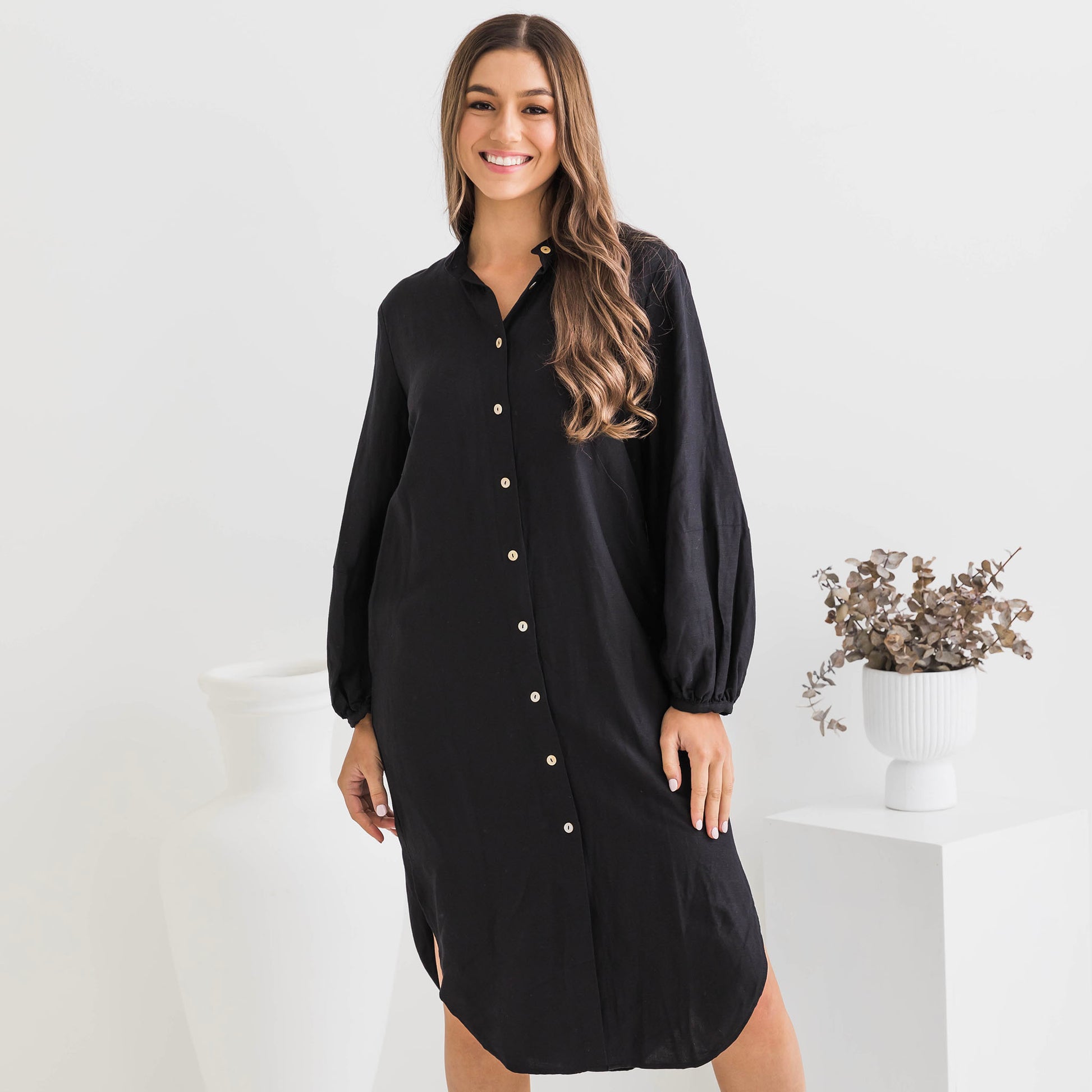 Isabella is a stylish, loose fit, below knee length shirt dress in soft medium weight black linen mix. Features a simple stand collar, long balloon styles sleeves gathered into a narrow cuff binding, front shell button closure, gathered back yoke, side seam pockets, optional waist tie and a curved hemline with side seam splits. Can be worn as a dress or layered open over pants or leggings.