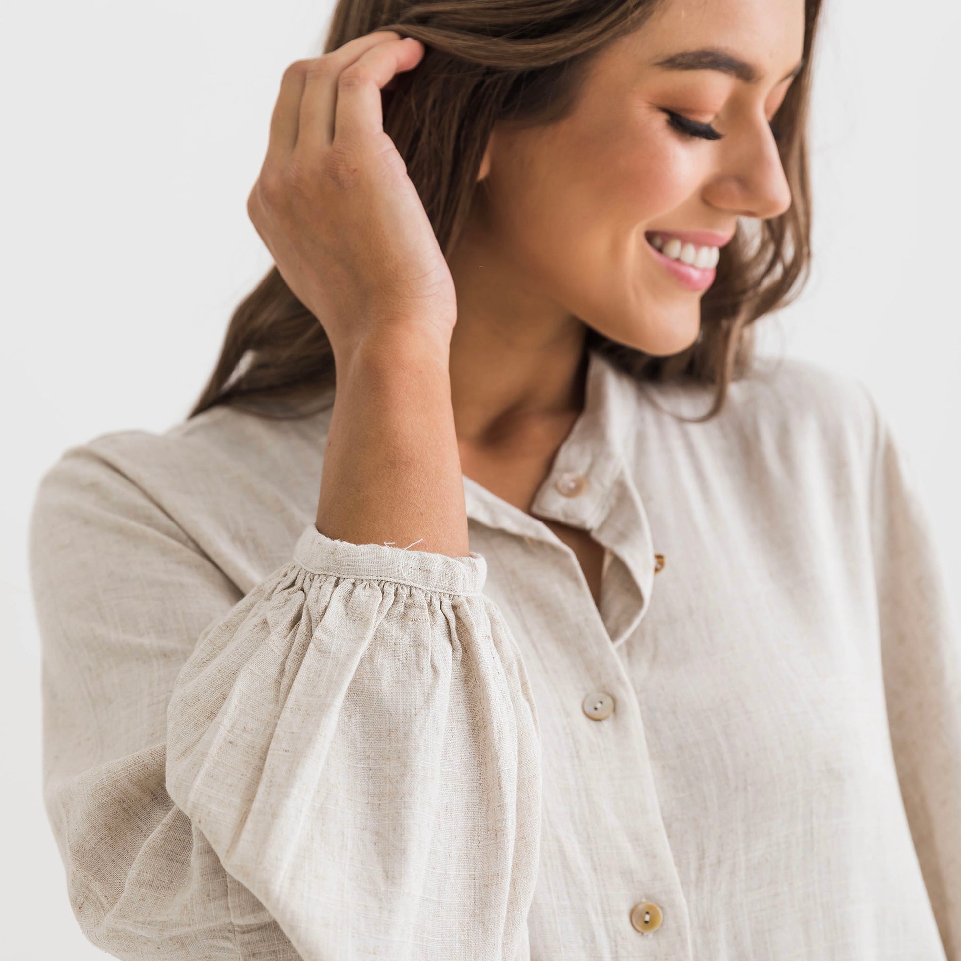 Isabella is a stylish, loose fit, below knee length shirt dress in soft medium weight oatmeal linen mix. Features a simple stand collar, long balloon styles sleeves gathered into a narrow cuff binding, front shell button closure, gathered back yoke, side seam pockets, optional waist tie and a curved hemline with side seam splits. Can be worn as a dress or layered open over pants or leggings.