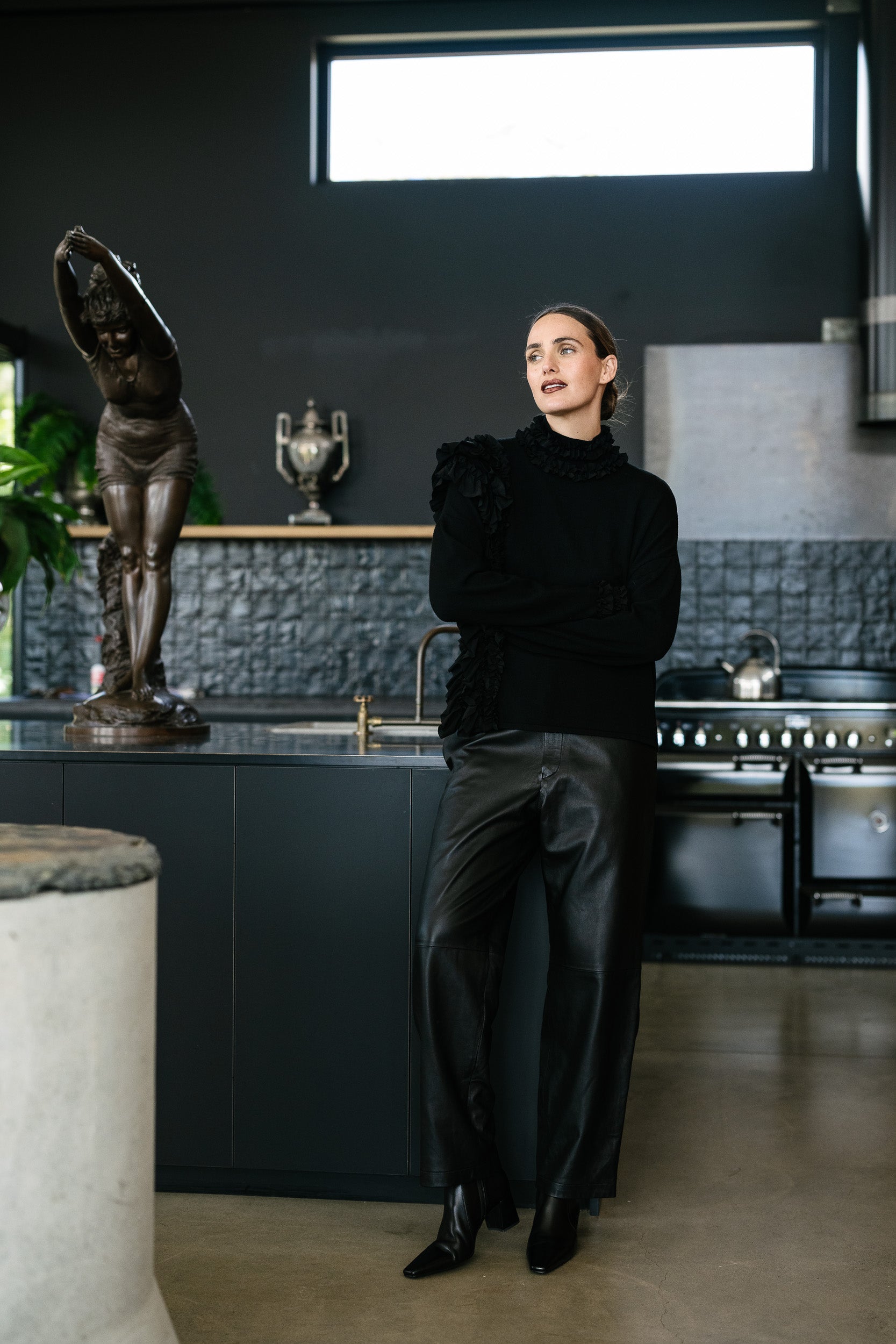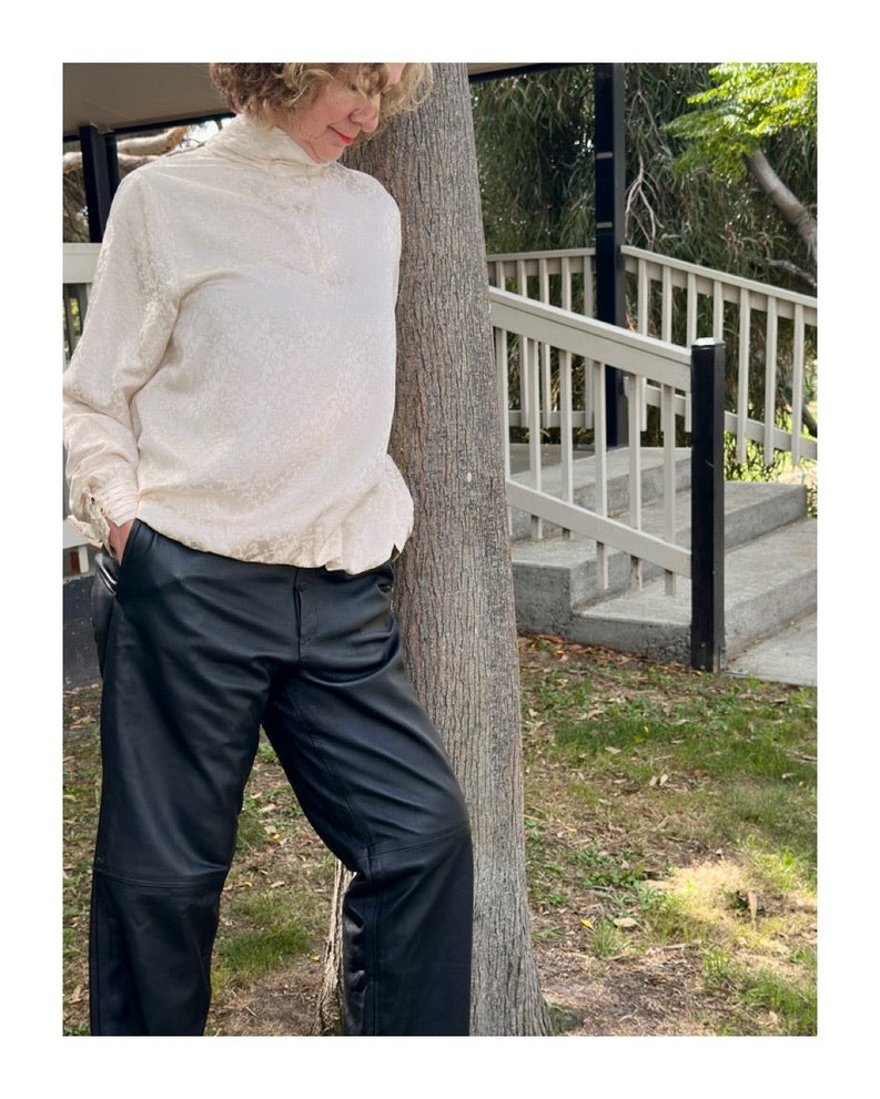 Tower by M.A. Dainty is a sophisticated, relaxed, wide leg pant in soft black lamb's leather with a cotton lining. Feature a flattering flat front waistband with a fly opening, a comfortable elasticised back and side seam pockets. Perfect for every day wear.