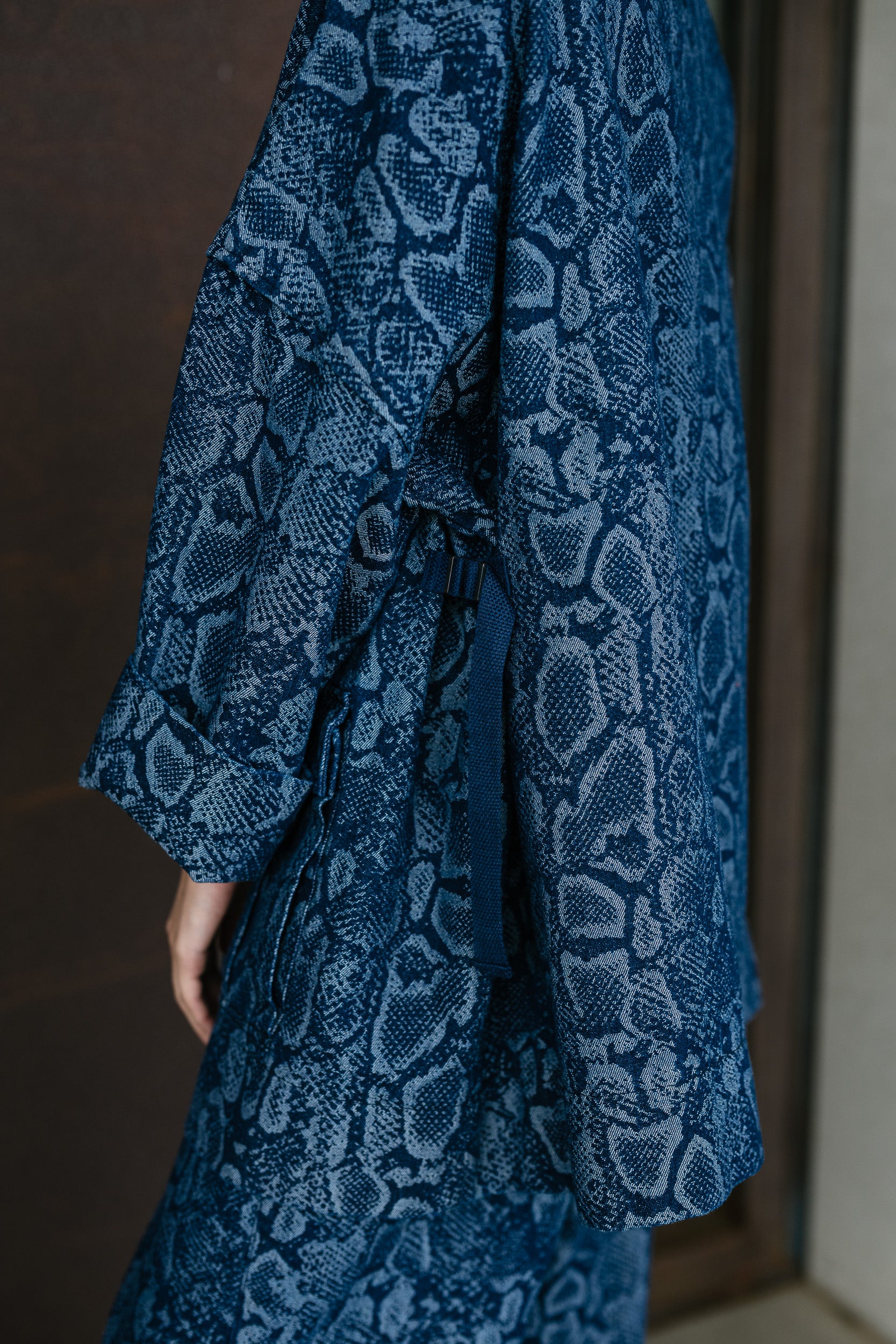 The popular Trucker Jeans by M.A. Dainty are a staple, versatile, unique pant that have just been released in a striking cotton polyester denim snake print. Feature a relaxed slightly oversized fit, adjustable drawstring waist with cord tie, zipped fly front with stud, inseam side pockets, single back pocket, wide leg, a bottom studded tie to cinch the legs and knee length zips so they can easily be transformed into long shorts.