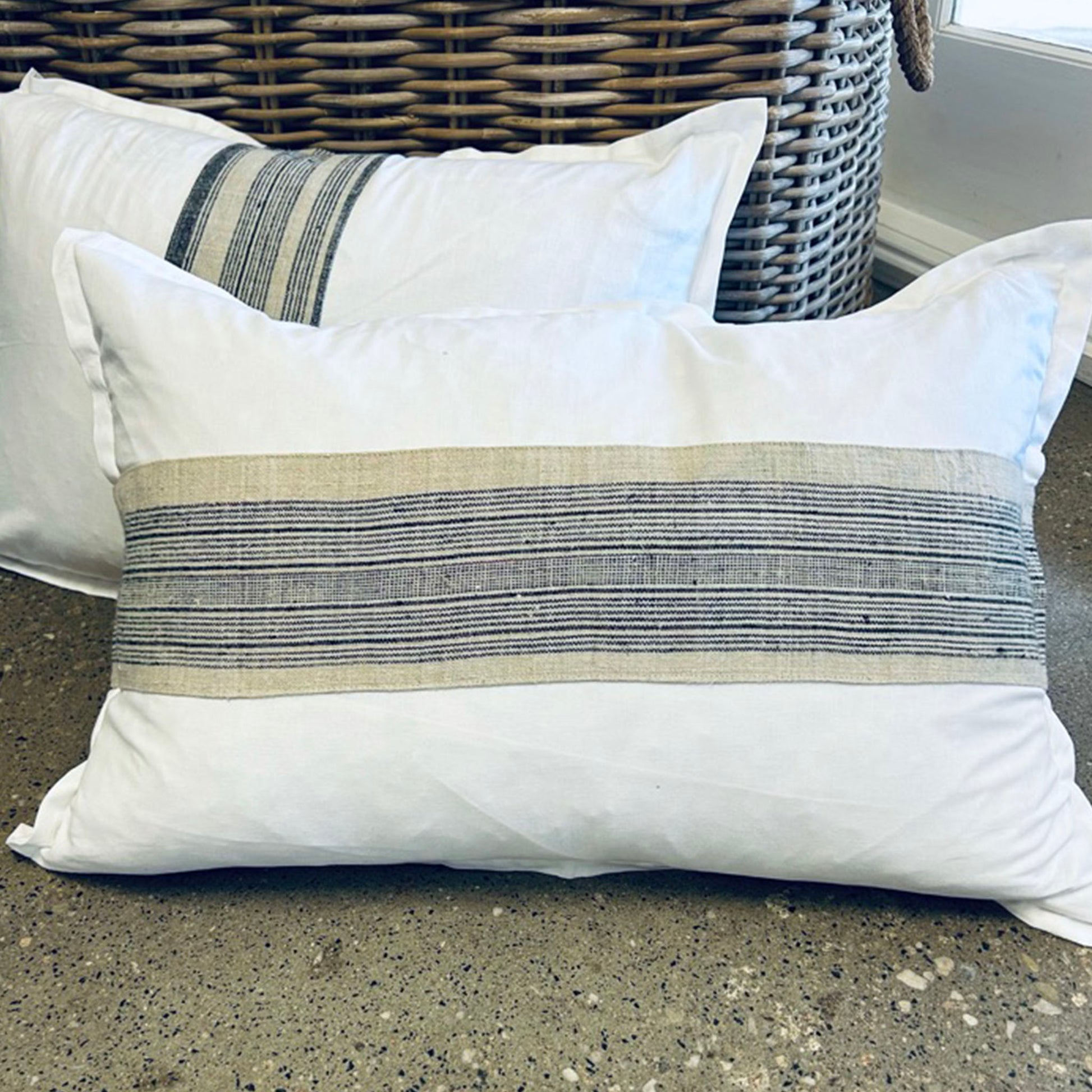Handcrafted white linen 40 x 60cm lumbar cushions, featuring a horizontal or vertical panel of hand woven hemp in naturally dyed navy and natural stripe from the Hmong district in northern Vietnam, invisible zip closure and a quality feather insert.